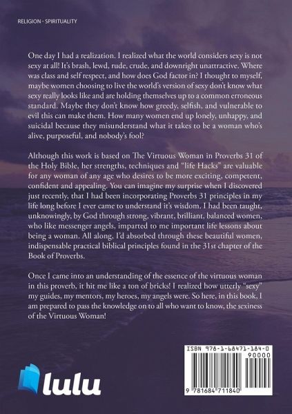 One day I had a realization. I realized what the world considers sexy is not sexy at all! It's brash, lewd, rude, crude, and downright unattractive. Where was class and self respect, and how does God factor in? I thought to myself, maybe women choosing to live the world's version of sexy don't know what sexy really looks like and are holding themselves up to a common erroneous standard. Maybe they don't know how greedy, selfish, and vulnerable to evil this can make them. How many women end up lonely, unhappy, and suicidal because they misunderstand what it takes to be a woman who's alive, purposeful, and nobody's fool? Although this work is based on The Virtuous Woman in Proverbs 31 of the Holy Bible, her strengths, techniques and "life Hacks" are valuable for any woman of any age who desires to be more exciting, competent, confident and appealing.