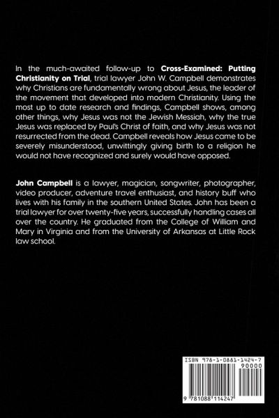 In the much-awaited follow-up to Cross-Examined: Putting Christianity on Trial, trial lawyer John W. Campbell demonstrates why Christians are fundamentally wrong about Jesus, the leader of the movement that developed into modern Christianity. Using the most up to date research and findings, Campbell shows, among other things, why Jesus was not the Jewish Messiah, why the true Jesus was replaced by Paul's Christ of faith, and why Jesus was not resurrected from the dead. Campbell reveals how Jesus came to be severely misunderstood, unwittingly giving birth to a religion he would not have recognized and surely would have opposed. Campbell explains who Jesus really was, what he believed, and why he would be so disappointed with modern Christianity.
