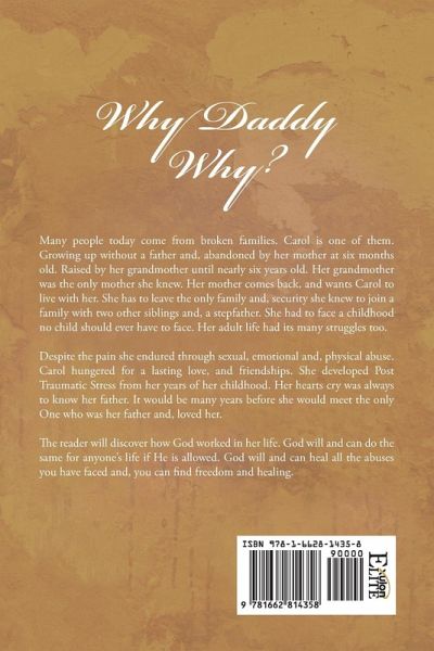 Many people today come from broken families. Carol is one of them. Growing up without a father and, abandoned by her mother at six months old. Raised by her grandmother until nearly six years old. Her grandmother was the only mother she knew. Her mother comes back, and wants Carol to live with her. She has to leave the only family and, security she knew to join a family with two other siblings and, a stepfather. She had to face a childhood no child should ever have to face. Her adult life had its many struggles too. Despite the pain she endured through sexual, emotional and, physical abuse. Carol hungered for a lasting love, and friendships. She developed Post Traumatic Stress from her years of her childhood. Her hearts cry was always to know her father. It would be many years before she would meet the only One who was her father and, loved her. The reader will discover how God worked in her life. God will and can do the same for anyone's life if He is allowed. God will and can heal all the abuses you have faced and, you can find freedom and healing. .