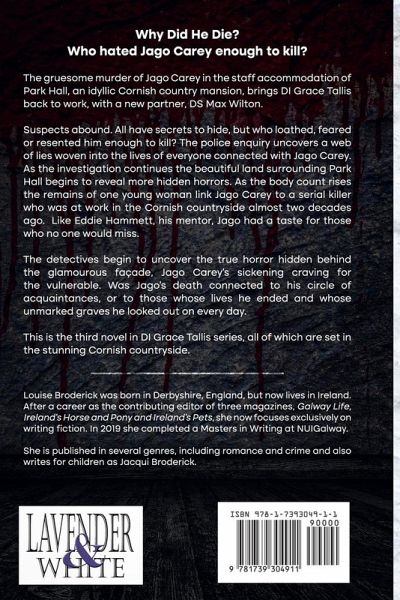 Why Did He Die?Who hated Jago Carey enough to kill him? The gruesome murder of Jago Carey in the staff accommodation of Park Hall, an idyllic Cornish country mansion, brings DI Grace Tallis back to work, with a new partner, DS Max Wilton. Suspects abound. All have secrets to hide, but who loathed, feared or resented him enough to kill? The police enquiry uncovers a web of lies woven into the lives of everyone connected with Jago Carey. As the investigation continues the beautiful land surrounding Park Hall begins to reveal more hidden horrors. As the body count rises the remains of one young woman link Jago Carey to a serial killer who was at work in the Cornish countryside almost two decades ago. Like Eddie Hammett, his mentor, Jago had a taste for those who no one would miss. The detectives begin to uncover the true horror hidden behind the glamourous façade, Jago Carey's sickening craving for the vulnerable. Was Jago's death connected to his circle of acquaintances, or to those whose lives he ended and whose unmarked graves he looked out on every day. This is the third novel in DI Grace Tallis series, all of which are set in the stunning Cornish countryside.