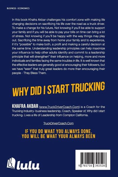 In this book Khafra Akbar challenges his comfort zone with making life changing decisions on sacrificing his life over the road as a truck driver. To make a change for his future, Not knowing if you'll be able to support your family and if you will be able to pay your bills on time can bring a lot of stress. Not knowing if you'll be happy with the way things may play out. Sacrificing the time away from home your family and to experience, if it's "possible" to make both, a profit and making a careful decision at the same time. Understanding leadership principles can help maximize your influence to help other adults identify and commit to a leadership principle that will strengthen" their influence on helping, more and more individuals and families facing the same troubles in life. It is well known that the effective leaders are generally good at encouraging their followers, but we have "seen" that truly great leaders do more than encouraging their people - They Bless Them.