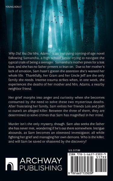Why Did You Die Mrs. Adams? is an intriguing coming-of-age novel following Samantha, a high school junior trying to navigate the typical trials of being a teenager. Samantha's mother pines for a lost love, and she has no father present to lean on. Due to her mother's lack of emotion, Sam hasn't gotten the attention she's wanted her whole life. Thankfully, her Gram and her Uncle Jeff are the only family she needs. Intense trauma strikes when, in one week, she experiences the deaths of her mother and Mrs. Adams, a nearby neighbor friend. Her grief morphs into anger and curiosity when she becomes consumed by the need to solve these two mysterious deaths. After frustrating her family, Sam enlists her friends Lois and Josh to outwit an alleged killer. Between the three of them, they are determined to solve crimes that Sam has magnified in her mind. Murder isn't the only mystery, though. Sam also seeks the father she has never met, wondering if he's out there somewhere. Intrigue abounds, as Sam becomes an obsessed investigator, all while fighting her grief and managing her own demons. Who is the killer, and will Sam be saved or shattered by the discovery?