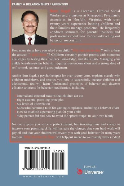 How many times have you asked your child, "Why did you do that?" only to hear the answer, "I don't know"? Children certainly provide parents with numerous challenges by testing their patience, knowledge, and skills daily. Managing your child's less-than-stellar behavior requires tremendous effort and a strong dose of self-control, patience, and good judgment. Author Burt Segal, a psychotherapist for over twenty years, explains exactly why children misbehave, and teaches you how to successfully manage children and adolescents. You will learn fundamental principles of behavior and discover effective solutions for behavior modification, including: Internal and external reasons that children act out Eight essential parenting principles Six levels of intervention Successful parenting tools for gaining compliance, including a behavior chart How to establish a parenting plan for your child Why parents fail and how to avoid the "parent traps" in your own family No one expects you to be a perfect parent, but investing time and energy to improve your parenting skills will increase the chances that your hard work will pay off and that your children will reward you with good behavior for many years to come. Why Did You Do That? will help put an end to your family battles today!