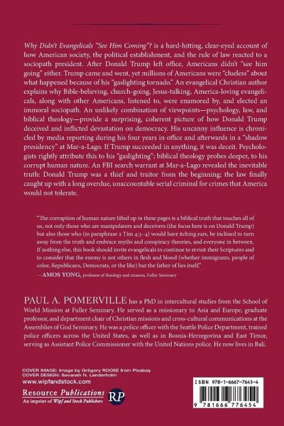Why Didn't Evangelicals ""See Him Coming""? is a hard-hitting, clear-eyed account of how American society, the political establishment, and the rule of law reacted to a sociopath president. After Donald Trump left office, Americans didn't ""see him going"" either. Trump came and went, yet millions of Americans were ""clueless"" about what happened because of his ""gaslighting tornado."" An evangelical Christian author explains why Bible-believing, church-going, Jesus-talking, America-loving evangelicals, along with other Americans, listened to, were enamored by, and elected an immoral sociopath. An unlikely combination of viewpoints--psychology, law, and biblical theology--provide a surprising, coherent picture of how Donald Trump deceived and inflicted devastation on democracy. His uncanny influence is chronicled by media reporting during his four years in office and afterwards in a ""shadow presidency"" at Mar-a-Lago. If Trump succeeded in anything, it was deceit. Psychologists rightly attribute this to his ""gaslighting""; biblical theology probes deeper, to his corrupt human nature. An FBI search warrant at Mar-a-Lago revealed the inevitable truth: Donald Trump was a thief and traitor from the beginning; the law finally caught up with a long overdue, unaccountable serial criminal for crimes that America would not tolerate.