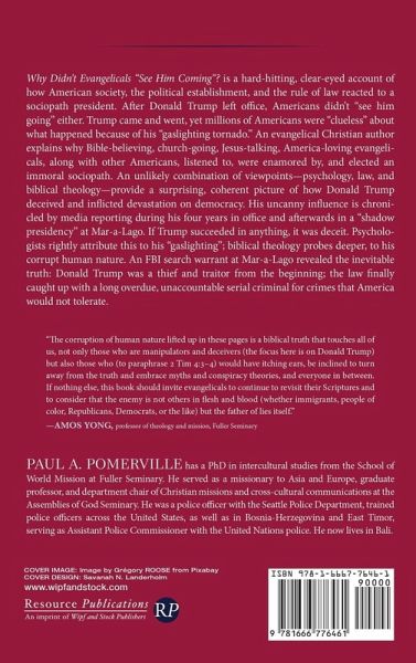 Why Didn't Evangelicals ""See Him Coming""? is a hard-hitting, clear-eyed account of how American society, the political establishment, and the rule of law reacted to a sociopath president. After Donald Trump left office, Americans didn't ""see him going"" either. Trump came and went, yet millions of Americans were ""clueless"" about what happened because of his ""gaslighting tornado."" An evangelical Christian author explains why Bible-believing, church-going, Jesus-talking, America-loving evangelicals, along with other Americans, listened to, were enamored by, and elected an immoral sociopath. An unlikely combination of viewpoints--psychology, law, and biblical theology--provide a surprising, coherent picture of how Donald Trump deceived and inflicted devastation on democracy. His uncanny influence is chronicled by media reporting during his four years in office and afterwards in a ""shadow presidency"" at Mar-a-Lago. If Trump succeeded in anything, it was deceit. Psychologists rightly attribute this to his ""gaslighting""; biblical theology probes deeper, to his corrupt human nature. An FBI search warrant at Mar-a-Lago revealed the inevitable truth: Donald Trump was a thief and traitor from the beginning; the law finally caught up with a long overdue, unaccountable serial criminal for crimes that America would not tolerate.