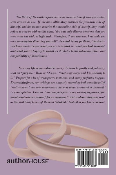 The thrill of the earth experience is the reconnection of two spirits that were created as one. If the man ultimately marries the feminine side of himself, and the woman marries the masculine side of herself, they would refuse to ever be without the other. You can only divorce someone that you were never one with, to begin with. Wherefore, if you were one, how could you even contemplate divorcing yourself? As noted by my publicist, "basically, you have made it clear what you are interested in, what you look to avoid, and what you're hoping to instill as it relates to the interconnection and compatibility of individuals." Since my life is more about ministry, I choose to quietly and patiently, wait on "purpose." Boaz or "No-az," "that's my story, and I'm sticking to it." Prepare for a lot of transparent moments, and many profound nuggets. Entertainingly so, my writings are uniquely colored by both comedic relief, "reality shows," and even commentary that may sound overstated or distasteful in your opinion. Even as I am unapologetic in my writing approach, you might want to brace yourself for an engaging "ride" and an intriguing read, as this will likely be one of the most "blackish" books that you have ever read.