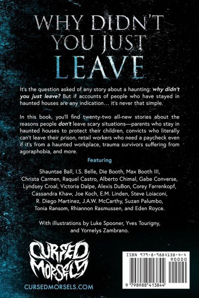 It's the question asked of any story about a haunting: why didn't you just leave? But if accounts of people who have stayed in haunted houses are any indication ... it's never that simple. In this book, you'll find twenty-two all-new stories about the reasons people don't leave scary situations-parents who stay in haunted houses to protect their children, convicts who literally can't leave their prison, retail workers who need a paycheck even if it's from a haunted workplace, trauma survivors suffering from agoraphobia, and more. Featuring Shauntae Ball, I.S. Belle, Die Booth, Max Booth III, Christa Carmen, Raquel Castro, Alberto Chimal, Gabe Converse, Lyndsey Croal, Victoria Dalpe, Alexis DuBon, Corey Farrenkopf, Cassandra Khaw, Joe Koch, E.M. Linden, Steve Loiaconi, R. Diego Martinez, J.A.W. McCarthy, Suzan Palumbo, Tonia Ransom, Rhiannon Rasmussen, and Eden Royce. With illustrations by Luke Spooner, Yves Tourigny, and Yornelys Zambrano.