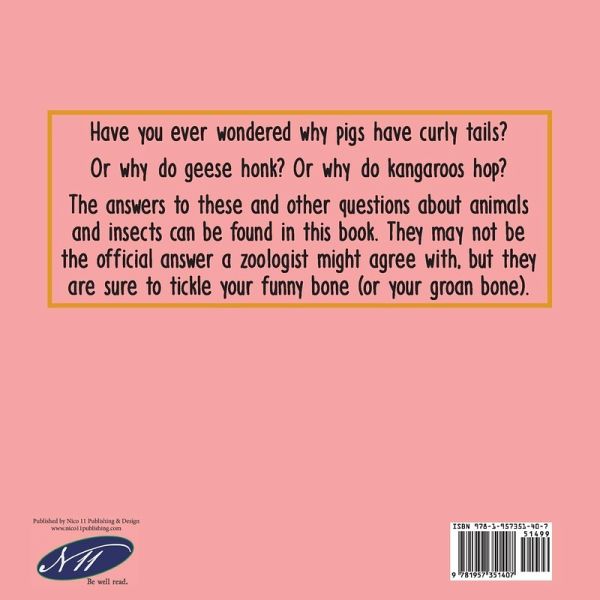 Have you ever wondered why pigs have curly tails? Or why do geese honk? Or why do kangaroos hop? The answers to these and other questions about animals and insects can be found in this book. They may not be the official answer a zoologist might agree with, but they are sure to tickle your funny bone (or your groan bone).