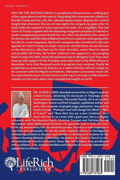 Why do the Heathen Rage? is a perplexity that presents a melting pot of the supernatural and the natural. Regarding this monumental collision of Donald Trump and the Left, the celestial teleprompter displays the central insight that whenever the son of man sights the serpent, he goes after its head while the serpent in return pursues his heels. It's a dog fight. The God factor in Trump coupled with the imposing octagonal causation of hatred no doubt conspicuously prime-timed him, for which the Heathen (the cartel of the Democrats and the Liberal Mainstream Press) could not resist going after him like in a mad vengeance. But God is unequivocally committed to His own agenda for which Trump is a major character. He therefore zeroes his eyes on the detractors, calls them out for their atrocities, warns them to repent and possibly fall in line. He further embraces the supporters, encouraging them to keep the faith, stand tall and kneel only to Almighty God. They must keep up with support of the President and return him to the White House in November 2020, that the good works in progress may continue. Finally He prophesies an assurance to America as a nation that He will not renege on his covenant with the Pilgrim forefathers. Ultimately Coronovirus wears off, the experiential peace of God returns ushering in normalcy while America remains an icon and a place most coveted and sought on earth.