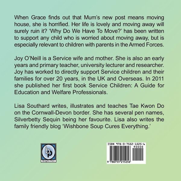 When Grace finds out that Mum's new post means moving house, she is horrified. Her life is lovely and moving away will surely ruin it? 'Why Do We Have To Move?' has been written to support any child who is worried about moving away, but is especially relevant to children with parents in the Armed Forces. Joy O'Neill is a Service wife and mother. She is also an early years and primary teacher, university lecturer and researcher. Joy has worked to directly support Service children and their families for over 20 years, in the UK and Overseas. In 2011 she published her first book Service Children: A Guide for Education and Welfare Professionals. Lisa Southard writes, illustrates and teaches Tae Kwon Do on the Cornwall-Devon border. She has several pen names, Silverbetty Sequin being her favourite. Lisa also writes the family friendly blog 'Wishbone Soup Cures Everything.'
