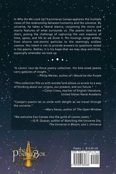 In Why Do We Look Up? Kazimieras Campe explores the multiple views of the relationship between humanity and the universe. By universe, he takes a liberal stance, conjoining the micro and macro features of what surrounds us. The poems tend to be short, posing the challenge of capturing the vast expanse of time, space, and life as we know it. His musings range widely, from elusive sub-atomic particles to the seemingly endless cosmos. His intent is not to provide answers to questions raised in the poems. Rather, it is his hope that we may stop and think, especially whenever we look up. --------------------- "Why Do We Look Up? is a cosmic tour-de-force poetry collection. His bite-sized poems carry galaxies of insight..." -Philip Wexler, author of I Would be the Purple "This collection fills us with wonder and allows us access to a way of thinking about our origins, our present, and our future." -Conor Cross, teacher of English literature, United States Naval Academy "Campe's poems let us smile with delight as we travel through the universe." -Mary Sesso, author of The Open Window "We welcome Kaz Campe into the guild of cosmic poets." -Q.R. Quasar, author of Watching the Universe Die