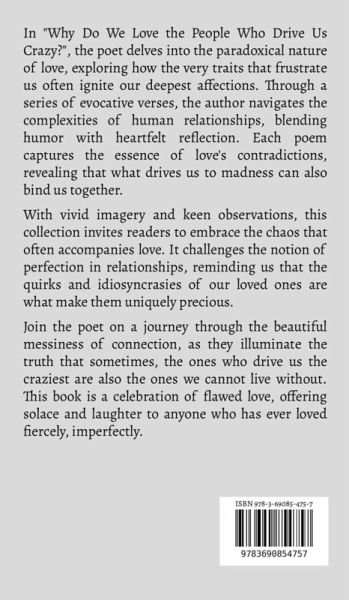 In "Why Do We Love the People Who Drive Us Crazy?", the poet delves into the paradoxical nature of love, exploring how the very traits that frustrate us often ignite our deepest affections. Through a series of evocative verses, the author navigates the complexities of human relationships, blending humor with heartfelt reflection. Each poem captures the essence of love's contradictions, revealing that what drives us to madness can also bind us together. With vivid imagery and keen observations, this collection invites readers to embrace the chaos that often accompanies love. It challenges the notion of perfection in relationships, reminding us that the quirks and idiosyncrasies of our loved ones are what make them uniquely precious. Join the poet on a journey through the beautiful messiness of connection, as they illuminate the truth that sometimes, the ones who drive us the craziest are also the ones we cannot live without. This book is a celebration of flawed love, offering solace and laughter to anyone who has ever loved fiercely, imperfectly.