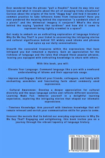Ever wondered how the phrase "pull a Houdini" found its way into our lexicon and what it reveals about the art of escaping tricky situations? Curious about the origins of the term "doggy bag" and how it became a common practice to take leftovers home from restaurants? Have you ever pondered the meaning behind the expression "a sandwich short of a picnic" and the whimsical imagery it conjures? What's the story behind the saying "packed like sardines" and how did it come to represent being tightly crowded in a space? Get ready to embark on an enthralling exploration of language history! Why Do We Say That? is your ticket to uncovering the intriguing stories and cultural significance behind 101 widely used idioms and phrases that spice up our daily conversations. Unearth the concealed treasures within the expressions that have intrigued you but remained a mystery. Gain an appreciation for the richness of language and the tales that shaped these popular phrases, leaving you equipped with enthralling knowledge to share with others. With this book, you will: Elevate Your Language: Command language like a pro with a newfound understanding of idioms and their appropriate usage. Impress and Engage: Enthrall your friends, colleagues, and family with enchanting anecdotes and fascinating facts about commonly used expressions. Cultural Awareness: Develop a deeper appreciation for cultural diversity and the ways language unites and reflects different societies. Learning Made Fun: Immerse yourself in a delightful learning experience, exploring the intriguing stories that shaped our idiomatic expressions. Timeless Knowledge: Arm yourself with timeless knowledge that will remain relevant and enrich your communication skills for years to come. Uncover the secrets that lie behind our everyday expressions in Why Do We Say That? Engaging and enlightening, this book invites you on a journey through the vibrant tapestry of language history. Grab your copy now and delve into the captivating world of idioms, phrases, sayings, and facts! Your linguistic adventure awaits!