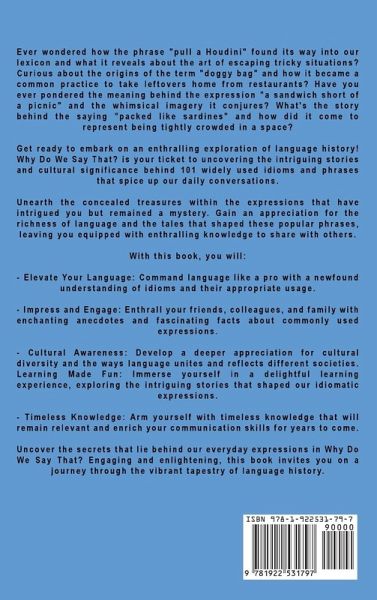 Ever wondered how the phrase "pull a Houdini" found its way into our lexicon and what it reveals about the art of escaping tricky situations? Curious about the origins of the term "doggy bag" and how it became a common practice to take leftovers home from restaurants? Have you ever pondered the meaning behind the expression "a sandwich short of a picnic" and the whimsical imagery it conjures? What's the story behind the saying "packed like sardines" and how did it come to represent being tightly crowded in a space? Get ready to embark on an enthralling exploration of language history! Why Do We Say That? is your ticket to uncovering the intriguing stories and cultural significance behind 101 widely used idioms and phrases that spice up our daily conversations. Unearth the concealed treasures within the expressions that have intrigued you but remained a mystery. Gain an appreciation for the richness of language and the tales that shaped these popular phrases, leaving you equipped with enthralling knowledge to share with others. With this book, you will: Elevate Your Language: Command language like a pro with a newfound understanding of idioms and their appropriate usage. Impress and Engage: Enthrall your friends, colleagues, and family with enchanting anecdotes and fascinating facts about commonly used expressions. Cultural Awareness: Develop a deeper appreciation for cultural diversity and the ways language unites and reflects different societies. Learning Made Fun: Immerse yourself in a delightful learning experience, exploring the intriguing stories that shaped our idiomatic expressions. Timeless Knowledge: Arm yourself with timeless knowledge that will remain relevant and enrich your communication skills for years to come. Uncover the secrets that lie behind our everyday expressions in Why Do We Say That? Engaging and enlightening, this book invites you on a journey through the vibrant tapestry of language history. Grab your copy now and delve into the captivating world of idioms, phrases, sayings, and facts! Your linguistic adventure awaits!