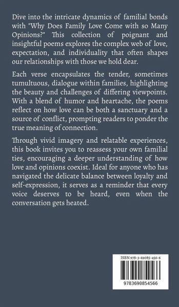 Dive into the intricate dynamics of familial bonds with "Why Does Family Love Come with so Many Opinions?" This collection of poignant and insightful poems explores the complex web of love, expectation, and individuality that often shapes our relationships with those we hold dear. Each verse encapsulates the tender, sometimes tumultuous, dialogue within families, highlighting the beauty and challenges of differing viewpoints. With a blend of humor and heartache, the poems reflect on how love can be both a sanctuary and a source of conflict, prompting readers to ponder the true meaning of connection. Through vivid imagery and relatable experiences, this book invites you to reassess your own familial ties, encouraging a deeper understanding of how love and opinions coexist. Ideal for anyone who has navigated the delicate balance between loyalty and self-expression, it serves as a reminder that every voice deserves to be heard, even when the conversation gets heated.