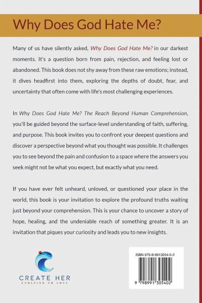 Many of us have silently asked, Why Does God Hate Me? in our darkest moments. It is a question born from pain, rejection, and feeling lost or abandoned. This book does not shy away from these raw emotions; instead, it dives headfirst into them, exploring the depths of doubt, fear, and uncertainty that often come with life's most challenging experiences. In Why Does God Hate Me? The Reach Beyond Human Comprehension, you will be guided beyond the surface-level understanding of faith, suffering, and purpose. This book invites you to confront your deepest questions and discover a perspective beyond what you thought was possible. It challenges you to see beyond the pain and confusion to a space where the answers you seek might not be what you expect, but exactly what you need. If you have ever felt unheard, unloved, or questioned your place in the world, this book is your invitation to explore the profound truths waiting just beyond your comprehension. This is your chance to uncover a story of hope, healing, and the undeniable reach of something greater. It is an invitation that piques your curiosity and leads you to new insights.