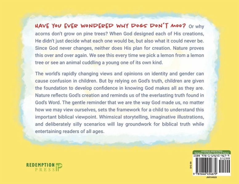 Have you ever wondered why dogs don't moo? Or why acorns don't grow on pine trees? When God designed each of His creations, He didn't just decide what each one would be, but also what it could never be. Since God never changes, neither does His plan for creation. Nature proves this over and over again. We see this every time we pick a lemon from a lemon tree or see an animal cuddling a young one of its own kind. The world's rapidly changing views and opinions on identity and gender can cause confusion in children. But by relying on God's truth, children are given the foundation to develop confidence in knowing God makes all as they are. Nature reflects God's creation and reminds us of the everlasting truth found in God's Word. The gentle reminder that we are the way God made us, no matter how we may view ourselves, sets the framework for a child to understand this important biblical viewpoint. Whimsical storytelling, imaginative illustrations, and deliberately silly scenarios will lay groundwork for biblical truth while entertaining readers of all ages.