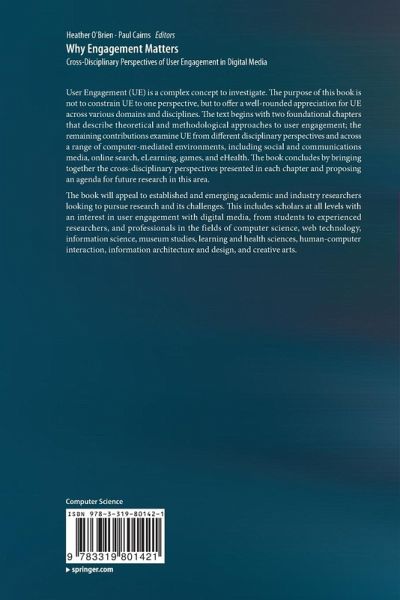 User Engagement (UE) is a complex concept to investigate. The purpose of this book is not to constrain UE to one perspective, but to offer a well-rounded appreciation for UE across various domains and disciplines. The text begins with two foundational chapters that describe theoretical and methodological approaches to user engagement; the remaining contributions examine UE from different disciplinary perspectives and across a range of computer-mediated environments, including social and communications media, online search, eLearning, games, and eHealth. The book concludes by bringing together the cross-disciplinary perspectives presented in each chapter and proposing an agenda for future research in this area.
