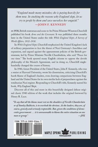 "England made many mistakes; she is paying heavily for them now. In studying the reasons why England slept, let us try to profit by them and save ourselves her anguish." - John F. Kennedy In 1938, British statesman and soon-to-be Prime Minister Winston Churchill published his book Arms and the Covenant. It was published three months later in the United States under the title While England Slept; A Survey of World Affairs, 1932-1938. In While England Slept, Churchill emphasized England's lack of military readiness or a realistic plan to face the threat of Hitler and Nazi Germany's Anschluss, their territorial aggression and expansionism into the rest of Europe. He particularly targeted in his critique, the British government, led by the Conservative Prime Minister Neville Chamberlain, directly leading to widespread public dissatisfaction over the Munich Agreement and England's dovish policy of "appeasement." In 1940, future President of the United States, John F. Kennedy, who was a senior at Harvard University, wrote his dissertation, criticizing Churchill's harsh blame of England's leaders, even drawing comparisons between England and the United States for its own similar lack of preparedness against the totalitarian Nazi regime. Alluding to the title While England Slept, named his book, Why England Slept. Discover all of this and more in this beautifully designed deluxe original classic 1940 edition of the work that includes the original foreword by Henry R. Luce. "To say that all the blame must rest on the shoulders of Neville Chamberlain or of Stanley Baldwin, is to overlook the obvious. As the leaders, they are, of course, gravely and seriously responsible. But, given the conditions of democratic government... it is unreasonable to blame the entire situation on one man or group." - JFK