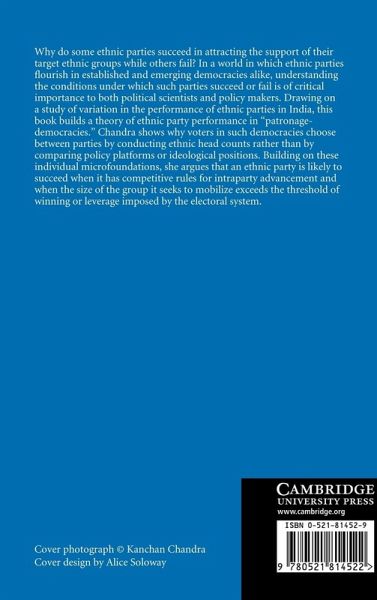 Why do some ethnic parties succeed in attracting the support of their target ethnic group while others fail? In a world in which ethnic parties flourish in both established and emerging democracies alike, understanding the conditions under which such parties rise and fall is of critical importance to both political scientists and policy makers. Drawing on a study of variation in the performance of ethnic parties in India, this book builds a theory of ethnic party performance in 'patronage democracies'. Chandra shows why individual voters and political entrepreneurs in such democracies condition their strategies not on party ideologies or policy platforms, but on a headcount of co-ethnics and others across party personnel and among the electorate.