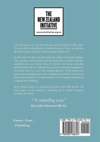 Over the past years, we have become used to Europe's debt crisis. However, the fiscal problems of countries such as Greece are only the tip of the iceberg. Europe's crisis has much deeper roots. In this essay, Dr Oliver Hartwich presents a sketch of Europe's decline. The continent that invented and dominated the modern world has gambled away its future. Run by distant and unaccountable political elites, the EU embarked on a project of political integration for which there was never any popular appetite. At the same time, government spending across the continent increased to levels never before seen in history. To make matters worse, Europe's population is ageing and shrinking. Why Europe Failed is a sobering account of the Old World's fall from grace. It also contains a warning not to repeat Europe's mistakes elsewhere. "A compelling essay" Hon John Howard OM AC
