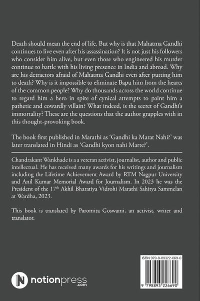 Death should mean the end of life. But why is that Mahatma Gandhi continues to live even after his assassination? It is not just his followers who consider him alive, but even those who engineered his murder continue to battle with his living presence in India and abroad. Why are his detractors afraid of Mahatma Gandhi even after putting him to death? Why is it impossible to eliminate Bapu him from the hearts of the common people? Why do thousands across the world continue to regard him a hero in spite of cynical attempts to paint him a pathetic and cowardly villain? What indeed, is the secret of Gandhi's immortality? These are the questions that the author grapples with in this thought-provoking book. The book first published in Marathi as 'Gandhi ka Marat Nahi?' was later translated in Hindi as 'Gandhi kyon nahi Marte?'.