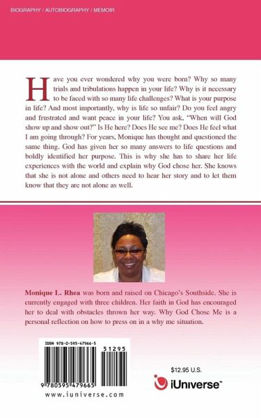 Have you ever wondered why you were born? Why so many trials and tribulations happen in your life? Why is it necessary to be faced with so many life challenges? What is your purpose in life? And most importantly, why is life so unfair? Do you feel angry and frustrated and want peace in your life? You ask, "When will God show up and show out?" Is He here? Does He see me? Does He feel what I am going through? For years, Monique has thought and questioned the same thing. God has given her so many answers to life questions and boldly identified her purpose. This is why she has to share her life experiences with the world and explain why God chose her. She knows that she is not alone and others need to hear her story and to let them know that they are not alone as well.