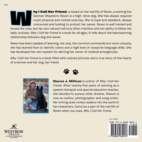 Why I Cal Her Fiend, is based on the real life of Raven, a working line German Shepherd. Raven is a high- drive dog. She has always required much physical and mental exercise. She is loyal and obedient, always concerned and looking to protect her owner. Raven is well trained and knows the rules, but her own natural instincts often interfere with her ability to follow the daily routines. Why I Call Her Friend is a book for all ages. It tells about the heartwarming relationship between dog and owner. Raven has been capable of learning, not only, the common commands but more uniquely, she has learned how to identify colors and a high level of receptive language skills. She has developed her own system for alerting her owner of medical emergencies. Why I Call Her Friend is a book fi lled with colored pictures and a true story of the hearts of a woman and her dog, her friend.