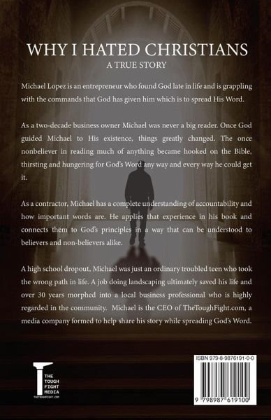 Michael Lopez is an entrepreneur who found God late in life and is grappling with the commands that God has given him which is to spread His Word. As a two-decade business owner Michael was never a big reader. Once God guided Michael to His existence, things greatly changed. The once nonbeliever in reading much of anything became hooked on the Bible, thirsting and hungering for God's Word any way and every way he could get it. As a contractor, Michael has a complete understanding of accountability and how important words are. He applies that experience in his book and connects them to God's principles in a way that can be understood to believers and non-believers alike. A high school dropout, Michael was just an ordinary troubled teen who took the wrong path in life. A job doing landscaping ultimately saved his life and over 30 years morphed into a local business professional who is highly regarded in the community. Michael is the CEO of TheToughFight.com, a media company formed to help share his story while spreading God's Word.
