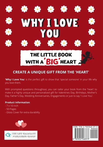 Are you looking for a gift that you can personalize to show that special someone in your life how much you love them? 'Why I Love You' is the perfect gift for your partner, friend, parent, or relative as it provides prompted questions throughout to tailor the book from your heart and make it a unique and personalized gift. With spaces to include photos, this book would be ideal for Valentine's Day, Birthdays, Anniversaries, Mother's Day, as a wedding gift or just to say 'I Love You'. Prompted questions include:If I could take you anywhere in the world, we would visit.. This was something special that you did for me that i will never forget..... I think your special 'super-power' is... When we are apart, I really miss...... With simple yet meaningful prompts and with ample space to write, this book is a great way to offer a personal touch. Fill it out and create your book in under an hour for a gift this is as beautifully unique as your loved one. Product Information: · 7 x 10 inch · 50 Pages · Space for photos · Gloss cover for extra durability