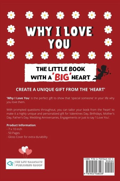 Are you looking for a gift that you can personalize to show that special someone in your life how much you love them? 'Why I Love You' is the perfect gift for your partner, friend, parent, or relative as it provides prompted questions throughout to tailor the book from your heart and make it a unique and personalized gift. With spaces to include photos, this book would be ideal for Valentine's Day, Birthdays, Anniversaries, Mother's Day, as a wedding gift or just to say 'I Love You'. Prompted questions include: · If I could take you anywhere in the world, we would visit.. · This was something special that you did for me that i will never forget..... · I think your special 'super-power' is... · When we are apart, I really miss...... With simple yet meaningful prompts and with ample space to write, this book is a great way to offer a personal touch. Fill it out and create your book in under an hour for a gift this is as beautifully unique as your loved one. ¿Product Information: · 7 x 10 inch · 50 Pages · Space for photos · Hardcover and gloss cover for extra durability