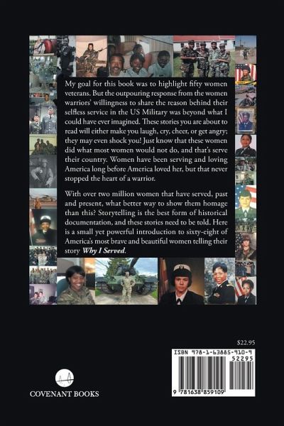 My goal for this book was to highlight fifty women veterans. But the outpouring response from the women warriors' willingness to share the reason behind their selfless service in the US Military was beyond what I could have ever imagined. These stories you are about to read will either make you laugh, cry, cheer, or get angry; they may even shock you! Just know that these women did what most women would not do, and that's serve their country. Women have been serving and loving America long before America loved her, but that never stopped the heart of a warrior. With over two million women that have served, past and present, what better way to show them homage than this? Storytelling is the best form of historical documentation, and these stories need to be told. Here is a small yet powerful introduction to sixty-eight of America's most brave and beautiful women telling their story Why I Served.