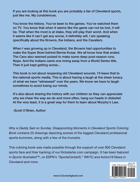A humorous coloring book for the whole family, depicting famous disappointing moments from Cleveland professional sports. Why is Daddy Sad on Sunday: Disappointing Moments in Cleveland Sports Coloring Book contains 25 drawings depicting scenes of the biggest Cleveland professional sports bummers, along with a few of the triumphs. The book also contains editorial descriptions of each scene, including commentary by the author. This coloring book was made possible through the support of over 800 Cleveland sports fans and their backing of our Kickstarter.com campaign. It has been featured in the pages of Sports Illustrated, on ESPN's Sportscenter, WKYC and Action19 news in Cleveland and more.