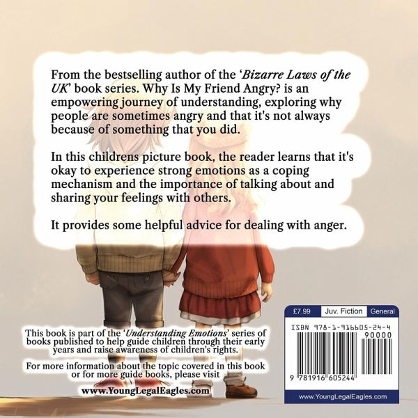 From the bestselling author of the 'Bizarre Laws of the UK' book series. Why Is My Friend Angry? is an empowering journey of understanding, exploring why people are sometimes angry and that it's not always because of something that you did. In this childrens picture book, the reader learns that it's okay to experience strong emotions as a coping mechanism and the importance of talking about and sharing your feelings with others. It provides some helpful advice for dealing with anger. Teach your children the importance of correctly dealing with emotions and understanding others, one of the most important life lessons a child can learn. This book is part of the 'Understanding Emotions' series of books published to help guide children through their early years and raise awareness of children's rights. 'Why Is My Friend Angry?' is intended for children of primary school age (ages 3-8yrs). We warmly recommend it to parents, teachers, and anyone who works with children.