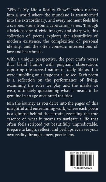 "Why Is My Life a Reality Show?" invites readers into a world where the mundane is transformed into the extraordinary, and every moment feels like a scripted scene from a captivating series. Through a kaleidoscope of vivid imagery and sharp wit, this collection of poems explores the absurdities of modern existence, the complexities of personal identity, and the often comedic intersections of love and heartbreak. With a unique perspective, the poet crafts verses that blend humor with poignant observation, capturing the surreal nature of daily life as if it were unfolding on a stage for all to see. Each poem is a reflection on the performance of living, examining the roles we play and the masks we wear, ultimately questioning what it means to be genuine in an age of curated realities. Join the journey as you delve into the pages of this insightful and entertaining work, where each poem is a glimpse behind the curtain, revealing the true essence of what it means to navigate a life that often feels scripted yet beautifully unpredictable. Prepare to laugh, reflect, and perhaps even see your own reality through a new, poetic lens.
