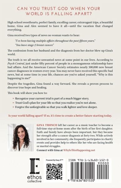 Can you Trust God When your World is Falling Apart? High school sweethearts, perfect family, excelling career, extravagant trips, a beautiful home, Gina and Alex seemed to have it all-until the vacation that changed everything. Gina received two types of news no woman wants to hear: "I've been having multiple affairs throughout the past fifteen years." "You have stage 2 breast cancer." The confession from her husband and the diagnosis from her doctor blew up Gina's world. The truth is we all receive unwanted news at some point in our lives. According to Psych Central, just under fifty percent of people in a monogamous relationship have had affairs. And the American Cancer Society estimates nearly 300,000 new breast cancer diagnoses in women every year. You may never have received this specific bad news, but at some time in your life, chances are you've asked yourself, "Why is this happening to me?" Despite the tragedies, Gina found a way forward. She reveals a proven process to discover true hope and healing. This book will show you how to: Recognize your current trial is part of a much bigger story. Trust God's plan for your life so that you realize you're not alone. Forgive the unforgivable so that you walk lighter and love deeper. Is your world falling apart? If so, it's time to create a better future starting today.