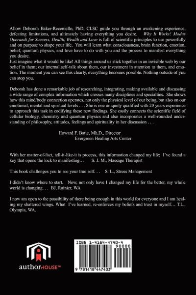 Allow Deborah Baker-Receniello to guide you through an awakening experience, defeating limitations, and ultimately having everything you desire. Why It Works! Modus Operandi for Success, Health, Wealth, and Love is full of scientific principles to use powerfully and on purpose to shape your life. You will learn what consciousness, brain function, emotion, belief, quantum physics, and love have to do with you and the process to manifest everything you desire. Just imagine what it would be like! All things around us stick together in an invisible web by our belief in them; our internal self-talk about them, our investment in attention to them, and emotion. The moment you can see this clearly, everything becomes possible. Nothing outside of you can stop you. Deborah Baker-Receniello, Ph.D. has done a remarkable job of researching, integrating, making available and discussing a wide range of complex information across many disciplines and specialties. She shows how this mind/body connection operates, not only the physical level of our being, but also on our emotional, mental and spiritual levels . She easily connects the scientific field and a well-rounded understanding of philosophy, attitudes, feelings and spirituality in her discussion . . .. Howard Batie, Director Evergreen Healing Arts Center With her matter-of-fact, tell-it-like-it is process, this information changed my life;. I've found a key that opens the lock to manifesting-- S. J. M., Massage Therapist This book challenges you to see your true self. . . S. L., Stress Management I didn't know where to start. Now, not only have I changed my life for the better, my whole world is changing. . . BJ, Rainer, WA I now am open to the possibility of there being enough in this world for everyone and I am healing my shattered wings. I've learned to reinforce my beliefs and trust in myself-- T.L., Olympia, WA