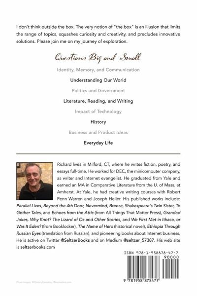THIRD PLACE: CT Press Club Professional Communications Contest for General Non-Fiction I don't think outside the box. There is no box. The box is an illusion that limits the range of what we consider, squashing curiosity and creativity, ruling out possible solutions. Many of these short essays derive from my belief that, as individuals and as a species, self-regulating mechanisms push us toward balance and reason and compassion. Our worst experiences and dreams can help nudge us in the "right" direction as if some force were trying to navigate a huge ship down a river, with the crudest of controls. I need to know who I am and why I am and how my life might matter in the context of those who came before me and those who will come after. But the answers offered by religion feel insufficient, and scientific knowledge has advanced to the point that it is beyond the understanding of laymen. I would like to participate in the endeavor of scientific discovery and make a contribution, but the advancement of science will not end in my lifetime and will probably never end. I need answers that make sense here and now. I do not adhere to any organized religion or established set of beliefs. But I am not an agnostic. Rather I am a seeker. Life has meaning and that meaning can be found, perhaps in interconnectedness and relationships, and perhaps by intuition rather than reason, and perhaps in flashes of insight. These essays cover: Big Questions; Identity, Memory, and Communication; Understanding the World We Live In; Politics and Government; Literature, Reading, and Writing; The Double-Edged Impact of Technology; History; Business and Product Ideas; and Everyday Life - How to Live, How to Cope.