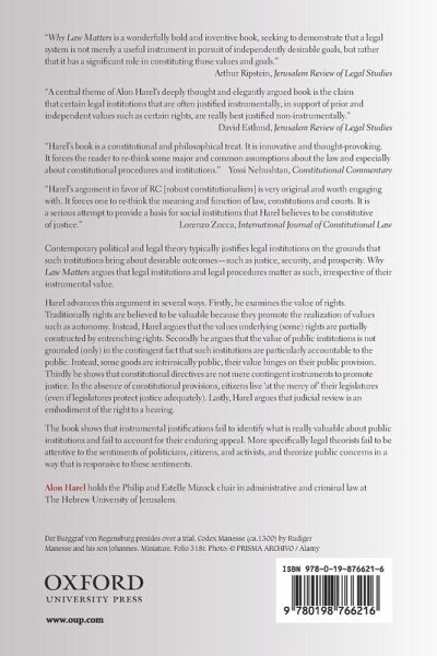 Contemporary political and legal theory typically justifies the value of political and legal institutions on the grounds that such institutions bring about desirable outcomes - such as justice, security, and prosperity. In the popular imagination, however, many people seem to value public institutions for their own sake. The idea that political and legal institutions might be intrinsically valuable has received little philosophical attention. Why Law Matters presents the argument that legal institutions and legal procedures are valuable and matter as such, irrespective of their instrumental value. Harel advances the argument in several ways. Firstly, he examines the value of rights. Traditionally it is believed that rights are valuable because they promote the realisation of values such as autonomy. Instead Harel argues that the values underlying (some) rights are partially constructed by entrenching rights. Secondly he argues that the value of public institutions are not grounded (ONLY) in the contingent fact that such institutions are particularly accountable to the public. Instead, some goods are intrinsically public; their value hinges on their public provision. Thirdly he shows that constitutional directives are not mere contingent instruments to promote justice. In the absence of constitutional entrenchment of rights, citizens live "at the mercy of" their legislatures (even if legislatures protect justice adequately). Lastly, Harel defends judicial review on the grounds that it is an embodiment of the right to a hearing. The book shows that instrumental justifications fail to identify what is really valuable about public institutions and fail to account for their enduring appeal. More specifically legal theorists fail to be attentive to the sentiments of politicians, citizens and activists and to theorise public concerns in a way that is responsive to these sentiments.
