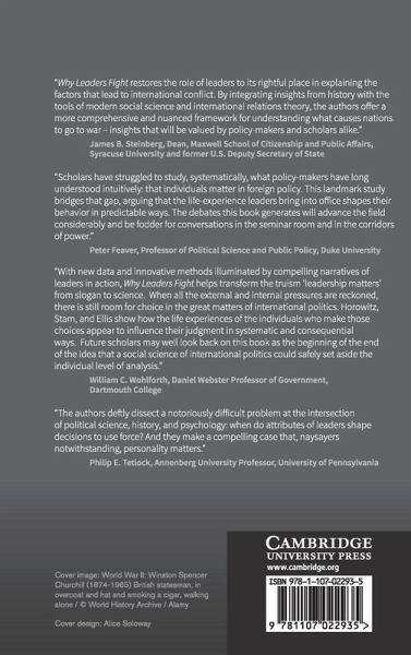 The history of political events is made by people. From wars to elections to political protests, the choices we make, our actions, how we behave, dictate events. Not all individuals have the same impact on our world and our lives. Some peoples' choices alter the pathways that history takes. In particular, national chief executives play a large role in forging the destinies of the countries they lead. Why Leaders Fight is about those world leaders and how their beliefs, world views, and tolerance for risk and military conflict are shaped by their life experiences before they enter office - military, family, occupation, and more. Using in-depth research on important leaders and the largest set of data on leader backgrounds ever gathered, the authors of Why Leaders Fight show that - within the constraints of domestic political institutions and the international system - who ends up in office plays a critical role in determining when and why countries go to war.