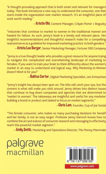 'A thought provoking approach that is both smart and relevant for managers today. Jenny explains that when marketing to women marketers must have a thorough understanding of their needs and context, which is often misunderstood. The book re-examines this and introduces a new way to understand the consumer, one that starts inside the organization over market research. It's an insightful piece of work worth reading.' -Kristin Obi, Content Manager, Crispin Porter + Bogusky