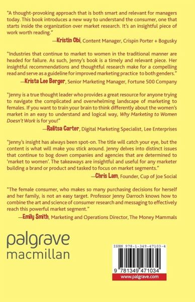 'A thought provoking approach that is both smart and relevant for managers today. Jenny explains that when marketing to women marketers must have a thorough understanding of their needs and context, which is often misunderstood. The book re-examines this and introduces a new way to understand the consumer, one that starts inside the organization over market research. It's an insightful piece of work worth reading.' -Kristin Obi, Content Manager, Crispin Porter + Bogusky