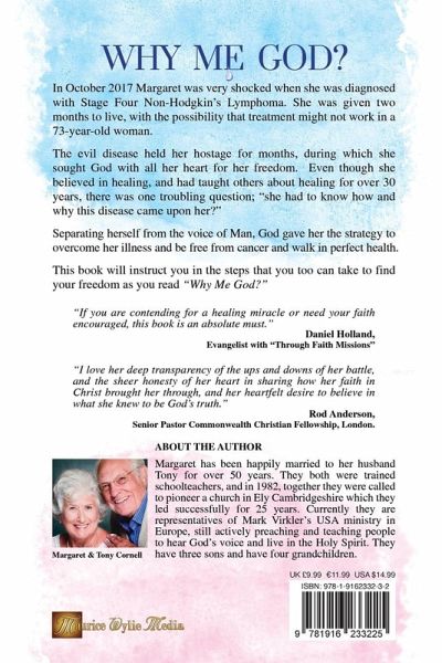In October 2017 Margaret was very shocked when she was diagnosed with Stage Four Non-Hodgkin's Lymphoma. She was given two months to live, with the possibility that treatment might not work in a 73-year-old woman.The evil disease held her hostage for months, during which she sought God with all her heart for her freedom. Even though she believed in healing, and taught others about healing for over thirty years, why would God allow or send this onto her? Separating herself from the voice of Man, God gave her the strategy to overcome her illness and be free from cancer and walk in perfect health. This book will instruct you in the steps that you too can take to find your freedom as you read "Why Me, God?"