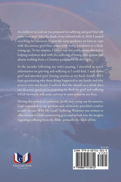 As a believer in God are you prepared for suffering and grief that will come your way? After the death of my beloved wife in 2018, I started searching for resources to provide some guidance on how to cope with the intense grief that comes with being a widower at a fairly young age. To my surprise, I found very few publications directed at helping widowers deal with the suffering of losing their spouse and almost nothing from a Christian perspective on the topic. In the months following my wife's passing, I absorbed as much information on grieving and suffering as I could find. I read about grief and attended grief sharing sessions at my local church. But I kept questioning why these things happened to my family and why prayers were not heard. I realized that the church as a whole does not do a very good job in preparing the flock for grief and suffering which inevitably will come our way at some point in our lives. During this period of confusion, doubt and crying out for answers, God responded to my protests and ultimately provided comfort as only he can. Why Me Lord?! Suffering Widower was written to offer witness to God's unwavering grace and to look into the insights regarding suffering from the Bible, primarily the book of Job.