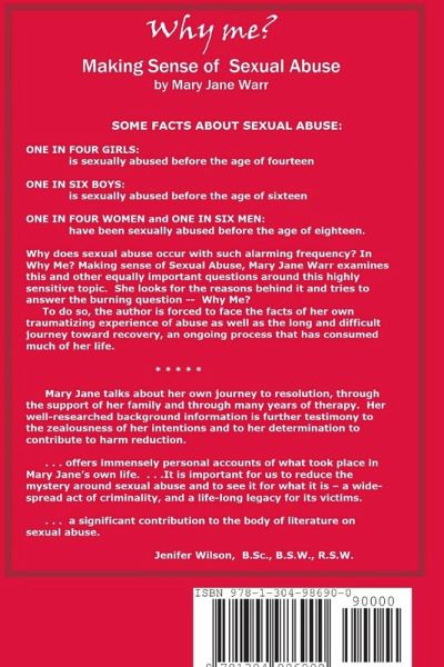 Why does sexual abuse occur with such alarming frequency? In Why Me? Making sense of Sexual Abuse, Mary Jane Warr examines this and other equally important questions around this highly sensitive topic. She looks for the reasons behind it and tries to answer the burning question -- Why Me? To do so, the author is forced to face the facts of her own traumatizing experience of abuse as well as the long and difficult journey toward recovery, an ongoing process that has consumed much of her life.