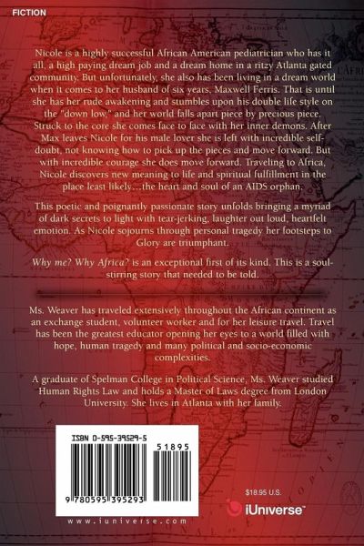 Nicole is a highly successful African American pediatrician who has it all, a high paying dream job and a dream home in a ritzy Atlanta gated community. But unfortunately, she also has been living in a dream world when it comes to her husband of six years, Maxwell Ferris. That is until she has her rude awakening and stumbles upon his double life style on the "down low," and her world falls apart piece by precious piece. Struck to the core she comes face to face with her inner demons. After Max leaves Nicole for his male lover she is left with incredible self doubt, not knowing how to pick up the pieces and move forward. But with incredible courage she does move forward. Traveling to Africa, Nicole discovers new meaning to life and spiritual fulfillment in the place least likely.the heart and soul of an AIDS orphan. This poetic and poignantly passionate story unfolds bringing a myriad of dark secrets to light with tear-jerking, laughter out loud, heartfelt emotion. As Nicole sojourns through personal tragedy her footsteps to Glory are triumphant. Why me? Why Africa? is an exceptional first of its kind. This is a soul stirring story that needed to be told.