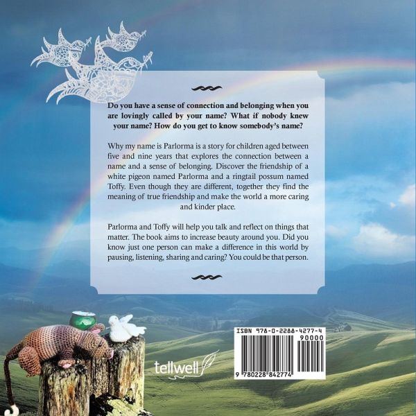 Why my name is Parlorma is a story for children aged between five and nine years that explores the connection between a name and a sense of belonging. Discover the friendship of a white pigeon named Parlorma and a ringtail possum named Toffy. Even though they are different, together they find the meaning of true friendship and make the world a more caring and kinder place. Parlorma and Toffy will help you talk and reflect on things that matter. The book aims to increase beauty around you. Did you know just one person can make a difference in this world by pausing, listening, sharing and caring? You could be that person.