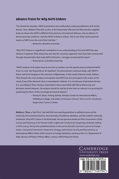 Wallace J. Thies is a Yale Ph.D. who has held full-time teaching positions in political science at the University of Connecticut (Storrs), the University of California, Berkeley, and the Catholic University of America. Why NATO Endures is his third book. His two previous books are When Governments Collide: Coercion and Diplomacy in the Vietnam Conflict (1980) and Friendly Rivals: Bargaining and Burden-Shifting in NATO (2003). He has also published articles in the Journal of Conflict Resolution, Journal of Strategic Studies, International Interactions, Comparative Strategy, and European Security. He has also served as an International Affairs Fellow of the Council on Foreign Relations, working at the US Department of State, Bureau of Politico-Military Affairs, and a NATO Research Fellow.