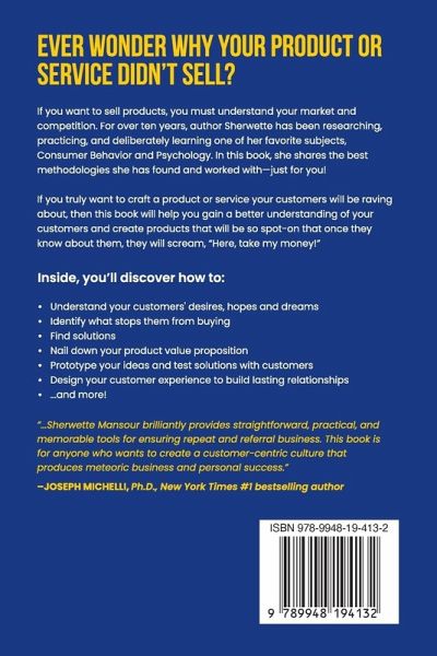 Ever wonder WHY your product or service didn't sell? If you want to sell products, you must understand your market and competition. For over ten years, author Sherwette has been researching, practicing, and deliberately learning one of her favorite subjects, Consumer Behavior and Psychology. In this book, she shares the best methodologies she has found and worked with-just for you! If you truly want to craft a product or service your customers will be raving about, then this book will help you gain a better understanding of your customers and create products that will be so spot-on that once they know about them, they will scream, "Here, take my money!"¿ Inside, you'll discover how to: Understand your customers' desires, hopes and dreams Identify what stops them from buying¿ Find solutions Nail down your product value proposition Prototype your ideas and test solutions with customers Design your customer experience to build lasting relationships ...and more! Get Why No One Is Buying Your Product today!