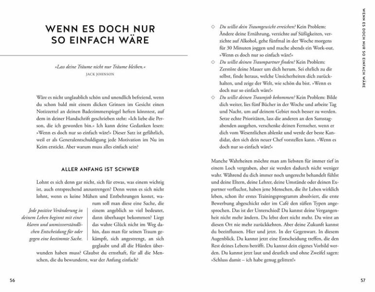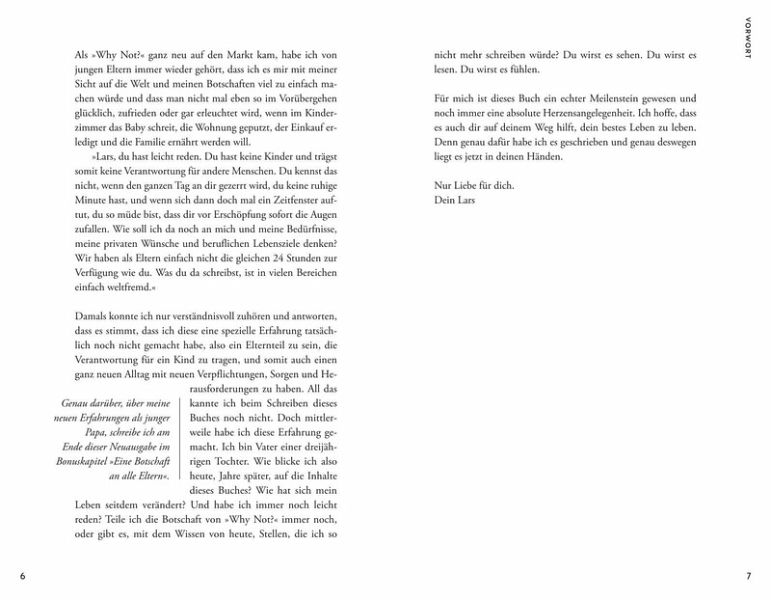 Ständig vergleichen wir uns mit anderen - den Erfolgreichen, Sportlichen, Glücklichen oder Gesunden. Dabei übersehen wir unser eigenes Potenzial. Lars Amend zeigt in seinem Buch, wie man seine Träume und Ziele verwirklicht und ein Leben führt, das man nie wieder eintauschen möchte. Als Coach begleitet er diesen Weg mit inspirierenden Gedankenexperimenten, tiefgehenden Fragen und kleinen Aufgaben, um innerlich zu wachsen und die eigene innere Haltung zu verändern. Denn: Unsere Grenzen setzen wir uns oft selbst, durch fehlenden Mut, Angst oder mangelndes Vertrauen in uns. Stattdessen sollten wir uns fragen: Warum eigentlich nicht? Why not? Am Ende findet der Leser die Antwort selbst - und es gibt kein Aber oder Geht-Nicht mehr!